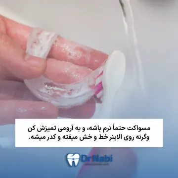 بعد از درآوردن، بلافاصله الاینر رو با با یه مسواک خیلی نرم (مثلا مسواک قدیمی خودت) و کمی صابون مایع یا صابون کف، آروم بشورش و زیر آب سرد یا نهایتا ولرم آب بکش. آب داغ دشمن الاینره و باعث تغییر شکلش میشه. تکون بده تا آب اضافه اش بره و بعد بذارش تو جعبه مخصوص خودش.