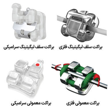 سلف لیگیت (Self-ligating): این براکتها نیازی به کش (اورینگ) ندارند و با یک در کوچک که بر روی آنها طراحی شده سیم را نگه میدارند.