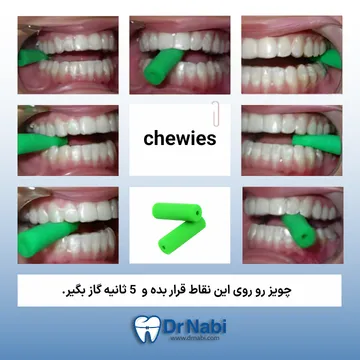 chewies یه قطعه نرم جویدنیه به اندازه دو بند انگشت. کافیه بذاریش بین دندونهات و حدود 5 ثانیه گاز بگیری و ول کنی. این کار رو روی دندونهای جلو و عقب، سمت راست و چپ، حدود 5 دقیقه و چند بار در روز انجام بده.