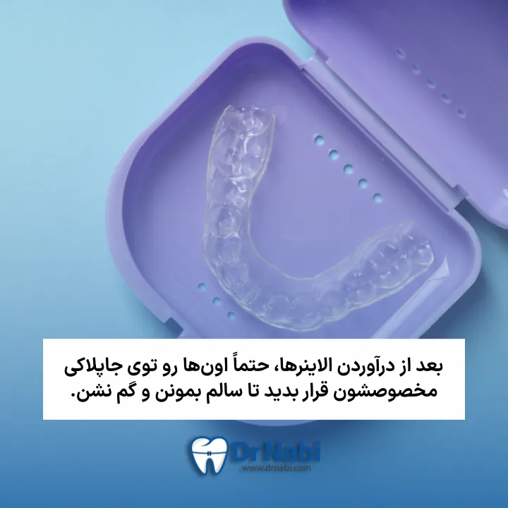 بعد از درآوردن، بلافاصله الاینر رو با با یه مسواک خیلی نرم (مثلا مسواک قدیمی خودت) و کمی صابون مایع یا صابون کف، آروم بشورش و زیر آب سرد یا نهایتا ولرم آب بکش. آب داغ دشمن الاینره و باعث تغییر شکلش میشه. تکون بده تا آب اضافه اش بره و بعد بذارش تو جعبه مخصوص خودش.