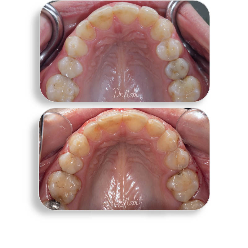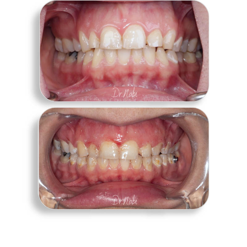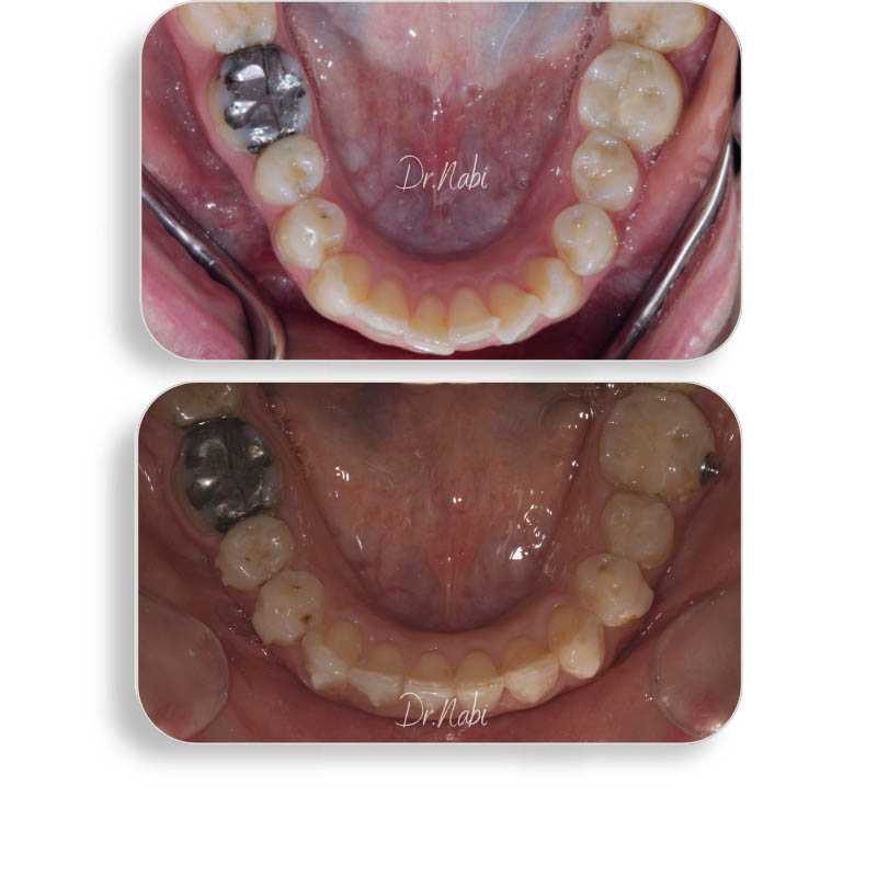 بیمار خانم 30ساله ای بودن که به جهت تراز نبودن خط وسط فک پایین و بالا، همچنین نامرتبی دندانها مراجعه کردند. فک بالا در حدود دو سال با ارتودنسی ثابت و کشیدن یک دندان درمان شد. درمان فک پایین 10 ماه زمان برد و با ارتودنسی نامرئی انجام شد.