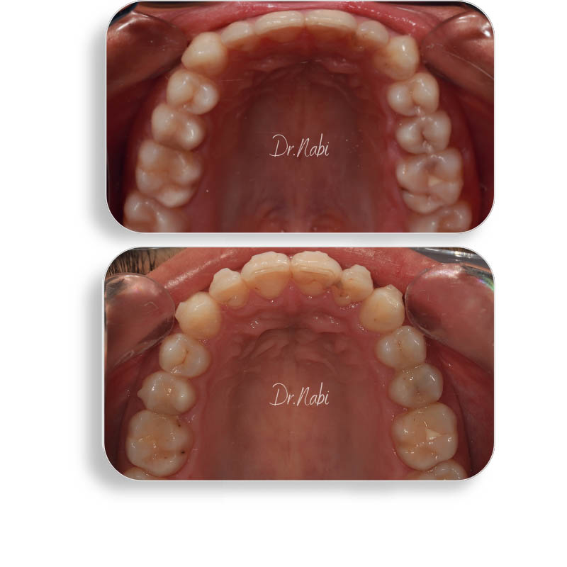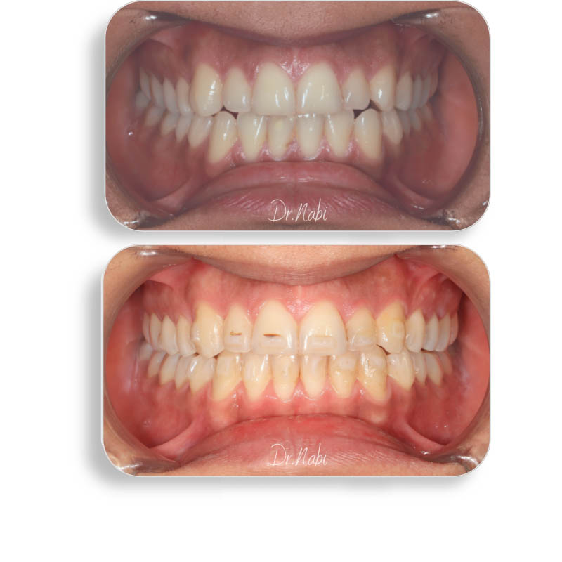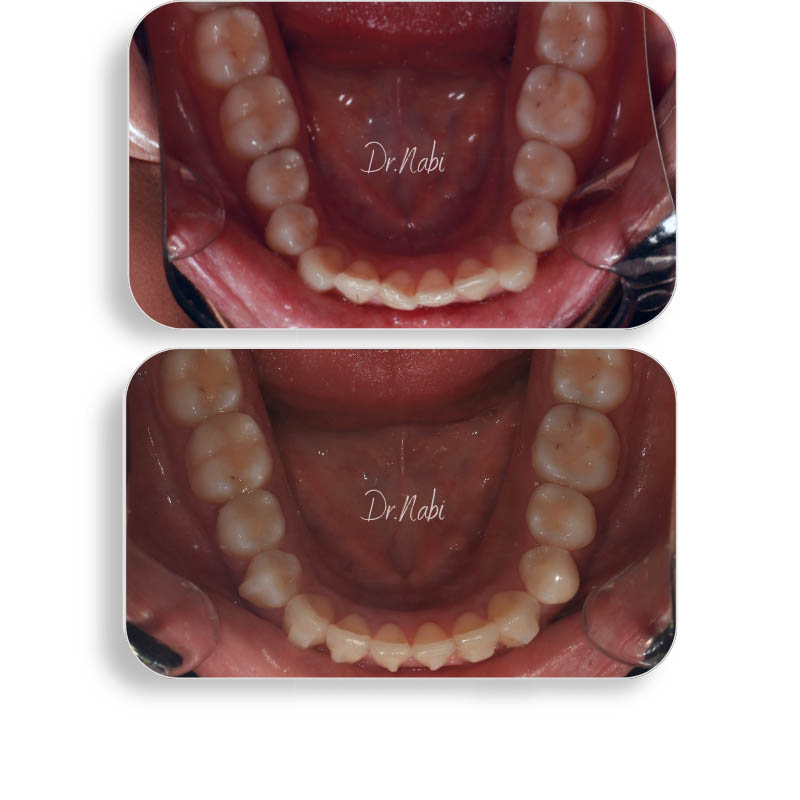 بیمار خانم 21 ساله ای هستند که برای رفع بیرون زدگی دندانهای نیش فک بالا و نامرتبی فک .پایین مراجعه کردند. درمان با ارتودنسی نامرئی در 6 ماه انجام شد