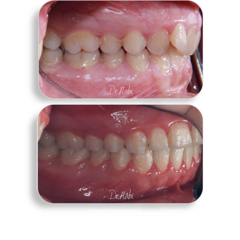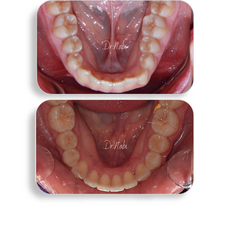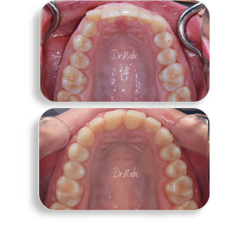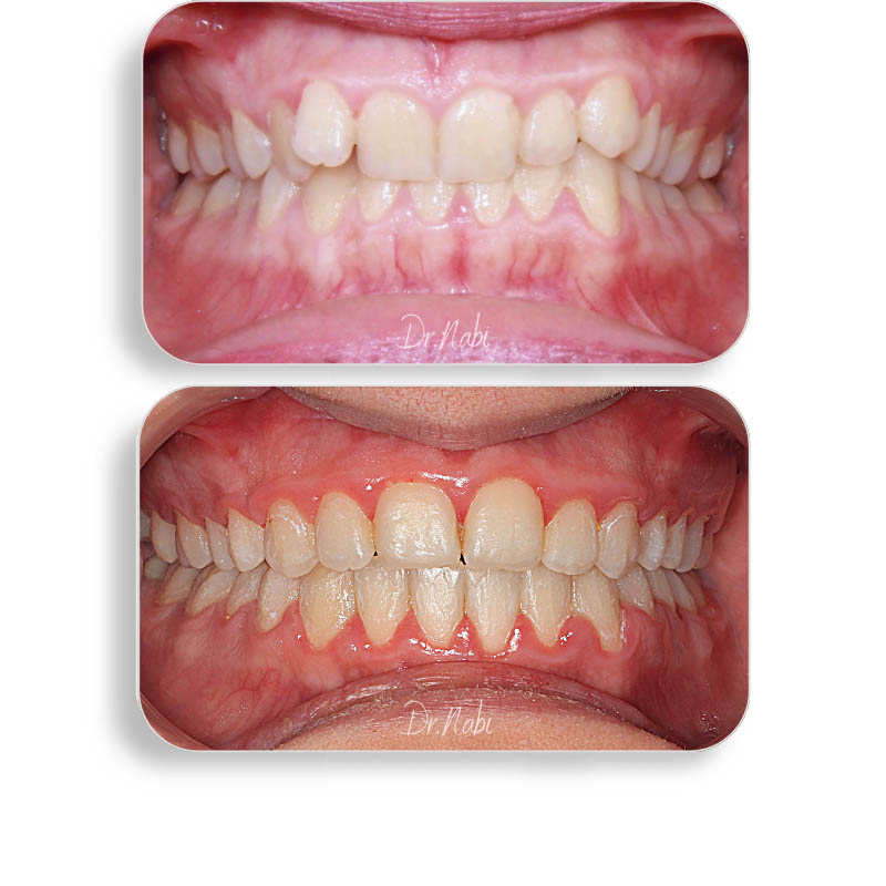 بیمار خانم 20 ساله که به جهت نامرتبی و اوربایت (همپوشانی عمودی بیش از حد فک بالا و پایین) دندانها مراجعه کردند. در کمتر از دو سال به نتیجه ای که ملاحظه می کنید رسیدیم.